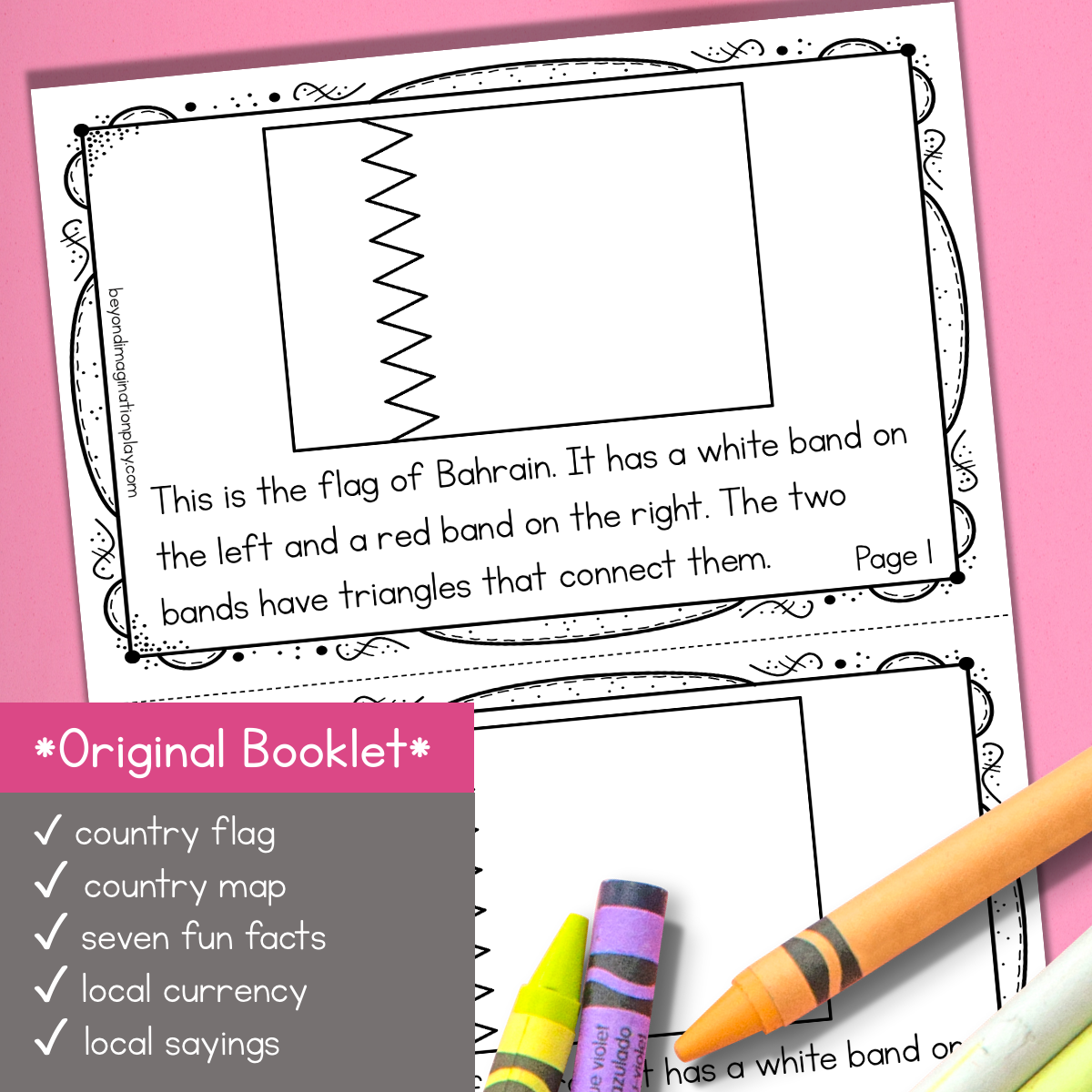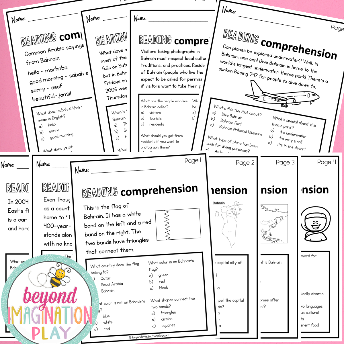 Let's explore the country of Bahrain! Your little one(s) will love this fun-fact-filled country study project, reading comprehension passages (same passages as the fun facts) with multi-choice questions, differentiated booklet options, boarding passes, postcards, and country-themed fun worksheet activities!