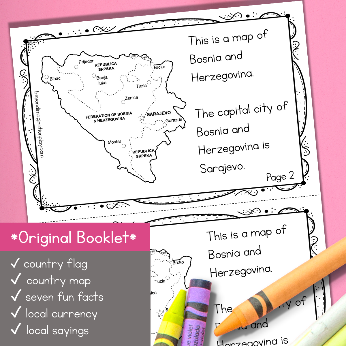Let's explore the country of Bosnia and Herzegovina! Your little one(s) will love this fun-fact-filled country study project, reading comprehension passages (same passages as the fun facts) with multi-choice questions, differentiated booklet options, boarding passes, postcards, and country-themed fun worksheet activities!