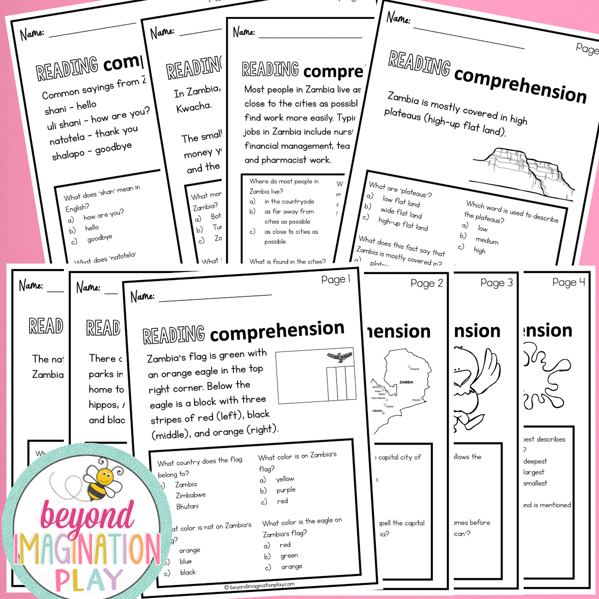 Get ready to dive into the incredible country of Zambia with our super fun Country Study Fun Fact Booklet and Reading Comprehension Sheets!